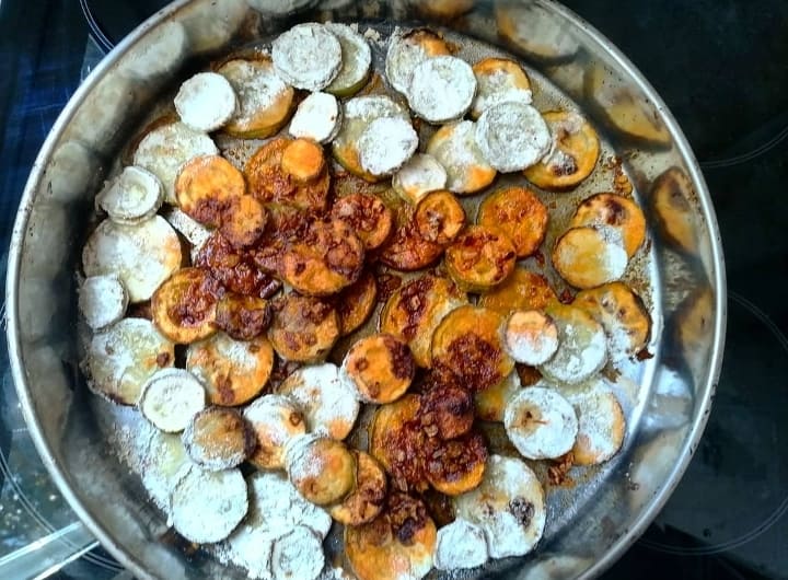 Измийте и нарежете тиквичките на кръгчета. Оваляйте ги в брашното, поставете ги във форма за печене и сложете във фурната. Гответе на 200 градуса за 10-15 минути или докато тиквичките покафенеят.