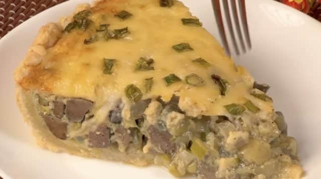 В отделна купа разбийте яйцата със солта, добавете майонезата и разбъркайте. Прибавете сместа с дробчетата и изсипете я върху тестото. Поръсете с настъргания кашкавал и нарязания зелен лук.