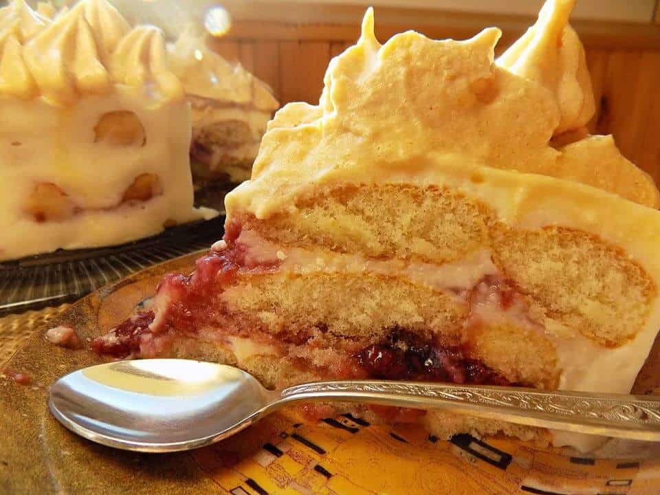 Във форма за торта с падащо дъно подреждам един ред бишкоти, напръсквам с 2-3 супени лъжици ром, изсипвам от горещия крем и заглаждам. Върху него насипвам от сладкото, заглаждам с лъжица и така до изчерпване на продуктите. Завършвам с крем. Оставям тортата в хладилник да стегне за няколко часа или за една нощ.
