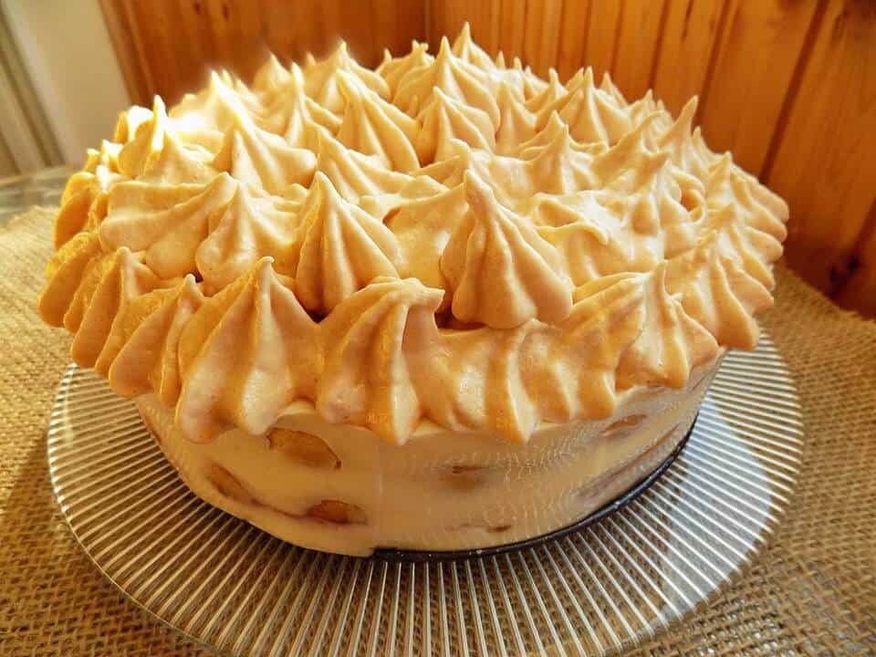 Изваждам тортата от формата и декорираме с карамеления меренг.