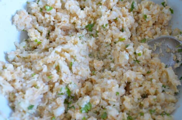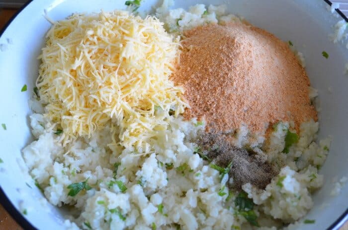 Измийте и нарежете магданоза. Счупете 1 яйце и разбийте. Добавете магданоза. Поставете към карфиола. Настържете кашкавала на ситно ренде. Сложете при останалите продукти. Поръсете с галетата, солта и черния пипер. Омесете добре.