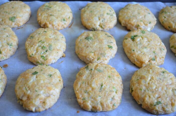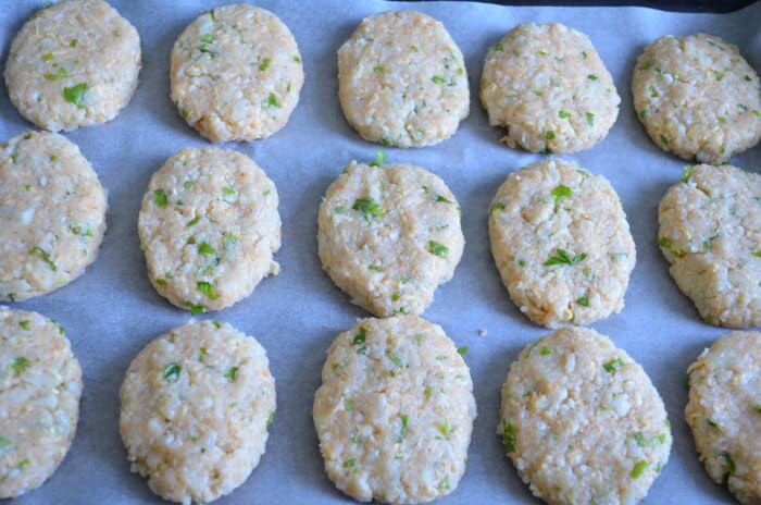 Покрийте форма за печене с хартия. Оформете средно големи кюфтета. Разбъркайте 2 яйца с малко олио и намажете.
