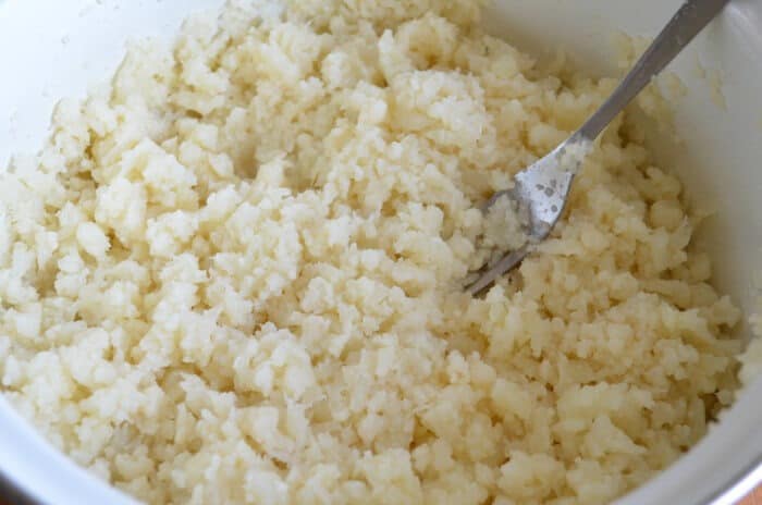 Измийте карфиола и накъсайте на розички. Напълнете тенджера с вода и посолете. Сложете на котлона и щом заври, пуснете карфиола. Гответе, докато зеленчука омекне. Извадете с решетъчна лъжица и измийте със студена вода. Подсушете с хавлиена кърпа. След това намачкайте с вилица. Ако пасирате сместа ще стане, твърде рядка.