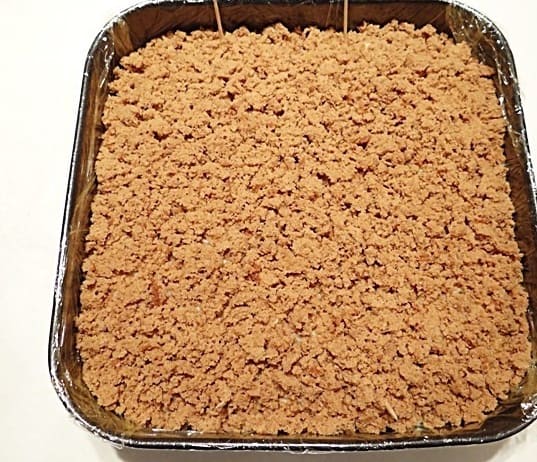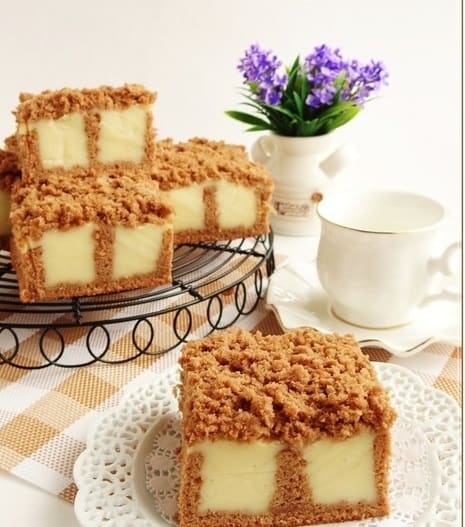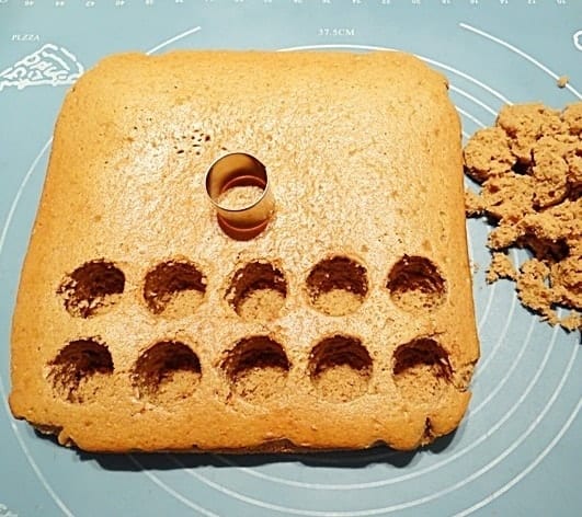 Вземете блата и подходящ уред или малка чаша, изрежете дупки. Трохите не изхвърляйте. Сложете продупчения блат в подходящ съд и полейте с крема. Натрошете трохите и покрийте десерта с тях.