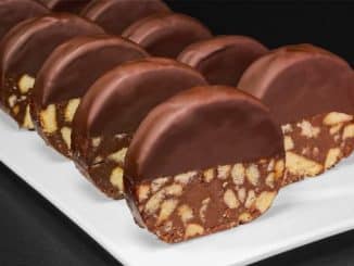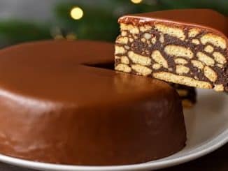 Необходими продукти: 500 грама обикновени бисквити 90 грама смлени орехи 250 грама прясно краве мляко 120 грама захар 10 грама ванилова захар 60 грама какао 150 грама краве масло За глазура: 140 грама шоколад Начин […]