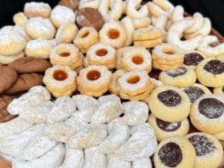 Необходими продукти: За тесто: 300 грама краве масло, на стайна температура 3 яйца 200 грама пудра захар 10 грама ванилова захар 1 чаена лъжичка бакпулвер щипка сол 700 грама брашно Още: За първите сладки: 50 […]