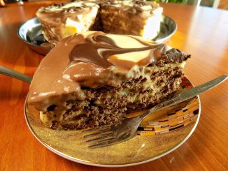 Необходими продукти: 1 голям пакет какаови бисквити „Закуска”( 1 голям пакет) За крема: 1 литър прясно краве мляко 3 жълтъка 8 супени лъжици захар 6 супени лъжици брашно 60 грама краве масло 1 ванилия За […]