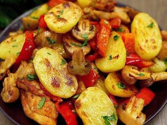 Необходими продукти: 4 броя пилешки бутчета 800 грама картофи 1 червена чушка 400 грама гъби печурки сол на вкус 1 чаена къжичка сладък червен пипер ½ чаена лъжичка сушен червен пипер ½ чаена къжичка риган […]