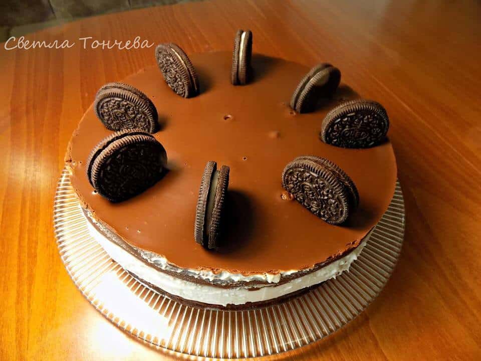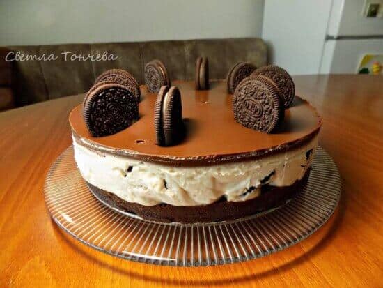 На водна баня се разтопява начупения шоколад заедно с 200 мл течна сметана и 40 грама краве масло. Бърка се до хомогенизиране. Оставя се да поизстине и се излива върху крема. Слага се на хладно да стегне. Отстранява се ринга и се украсява с бисквитки „Орео“.