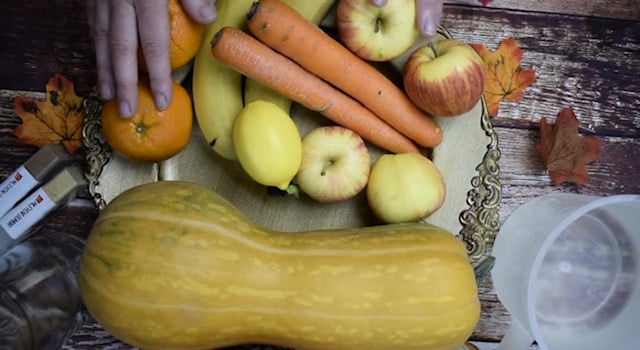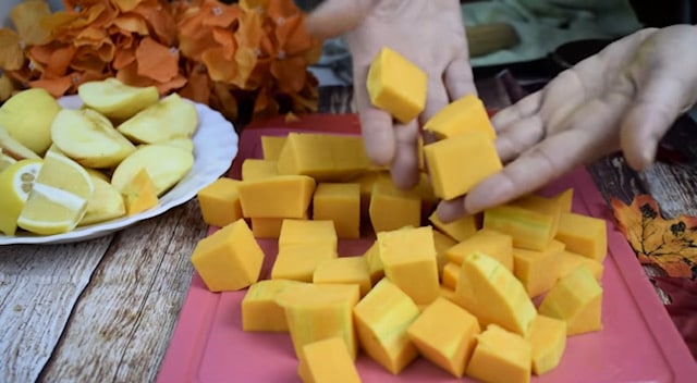 Обелете тиквата и я нарежете на кубчета, след което я добавете към морковите. Прибавете останалите нарязани плодове.