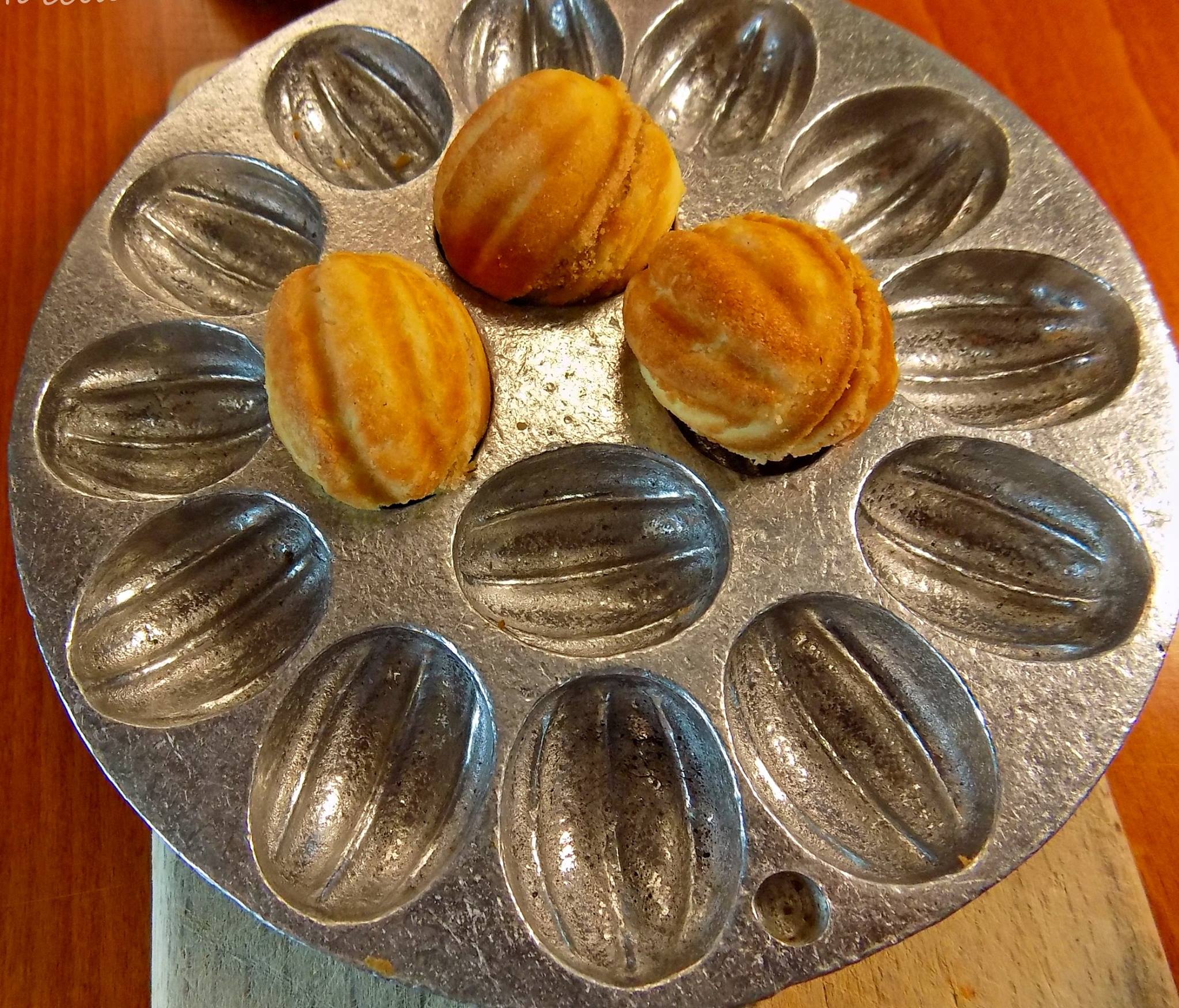 След това вадя и оформям топчета с големината на лешник. Поставям всяко в гнездото на формата за орехчета, която предварително съм загряла на котлона. Затварям и пека, докато порозовеят. Вадя и оставям да се охладят.