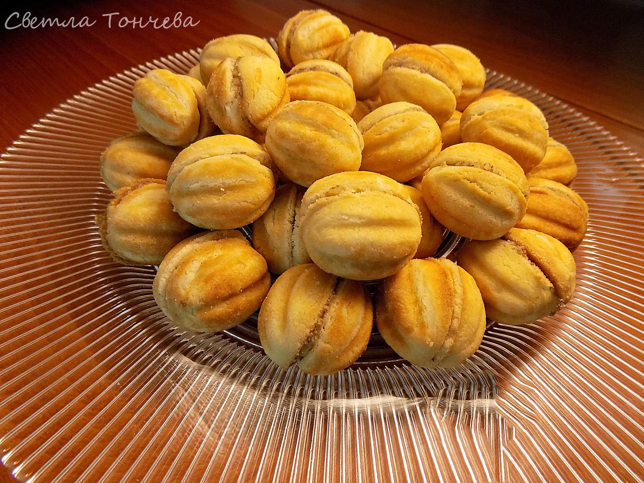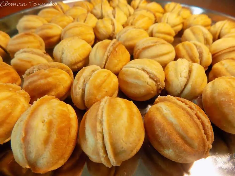 Приготвям крема, като разбивам белтъците заедно със захарта. Бия с миксер на максимална мощност до получаване на гъст бял крем с остри върхове. Смилам орехите и ги прибавям към крема. Разбърквам внимателно с шпатула. Не ползвам миксер, за да не изгубя обема на белтъците. След това с този крем пълня орехчетата и слпевам по две.