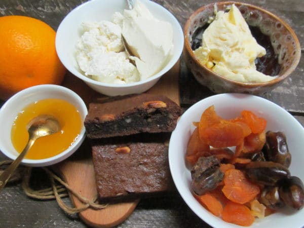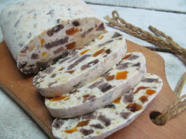 Измийте добре един портокал и го подсушете. На едро ренде настържете кората му. Добавете към сместа. Изцедете сока на плода и добавете. Нарежете супените плодове и прибавете към останалите продукти. Начупете бисквитите (или нарежете кекса на малки парчета). Добавете към сместа и разбъркайте с шпатула.