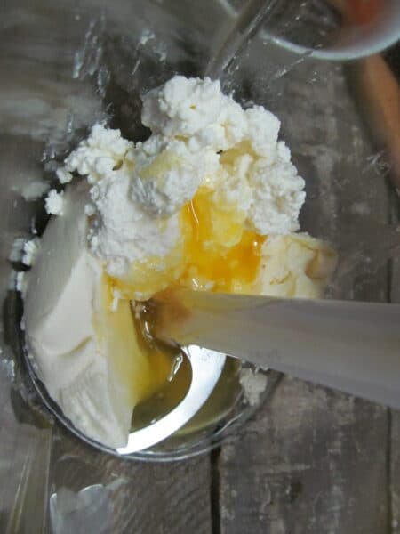 Започнете приготвянето на десерта, като в подходящ съд поставете изварата, крем сиренето, кравето масло и меда. Вземете пасатор и пасирайте.