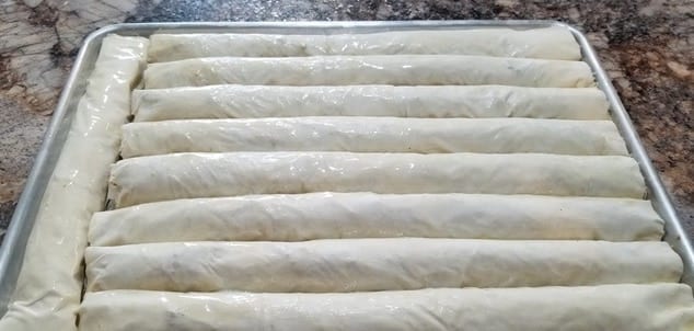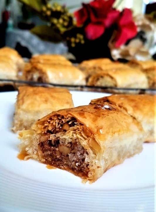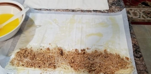Върху работна повърхност, покрита с хартия, сложете две кори за баклава и намаслете с малко разтопено масло. Разстелете кадаифа по дългата страна на кората и го поръсете с орехи и лешници. Навийте на руло. Повторете с останалите продукти. От посочените съставки трябва сполучите 9 рула.