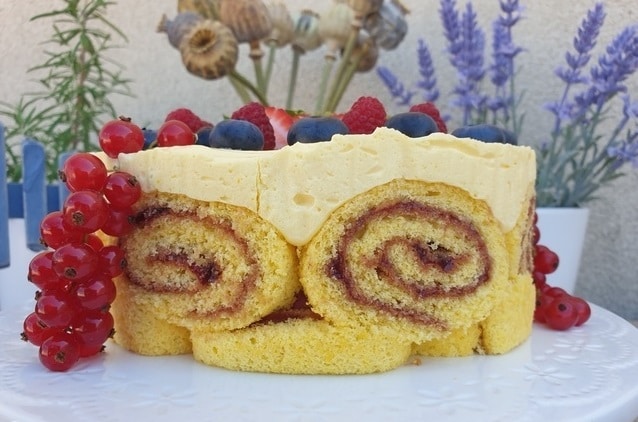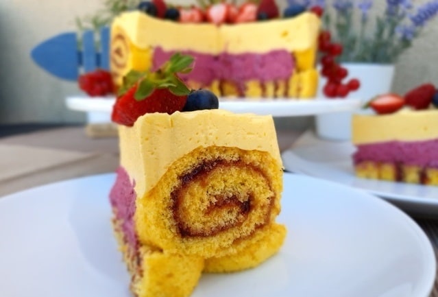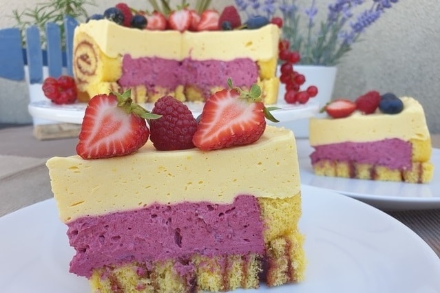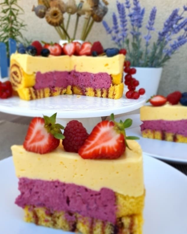 Вземете рулата и ги нарежете на парчета. Подредете във форма за печене, като покриете дъното стените ѝ с парчетата. Върху тях сипете крема от горски плодове. Сложете в хладилник.