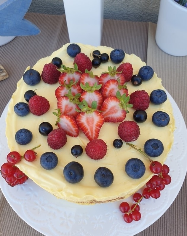 Извадете и декорирайте с пресни плодове. Нарежете и поднесете.