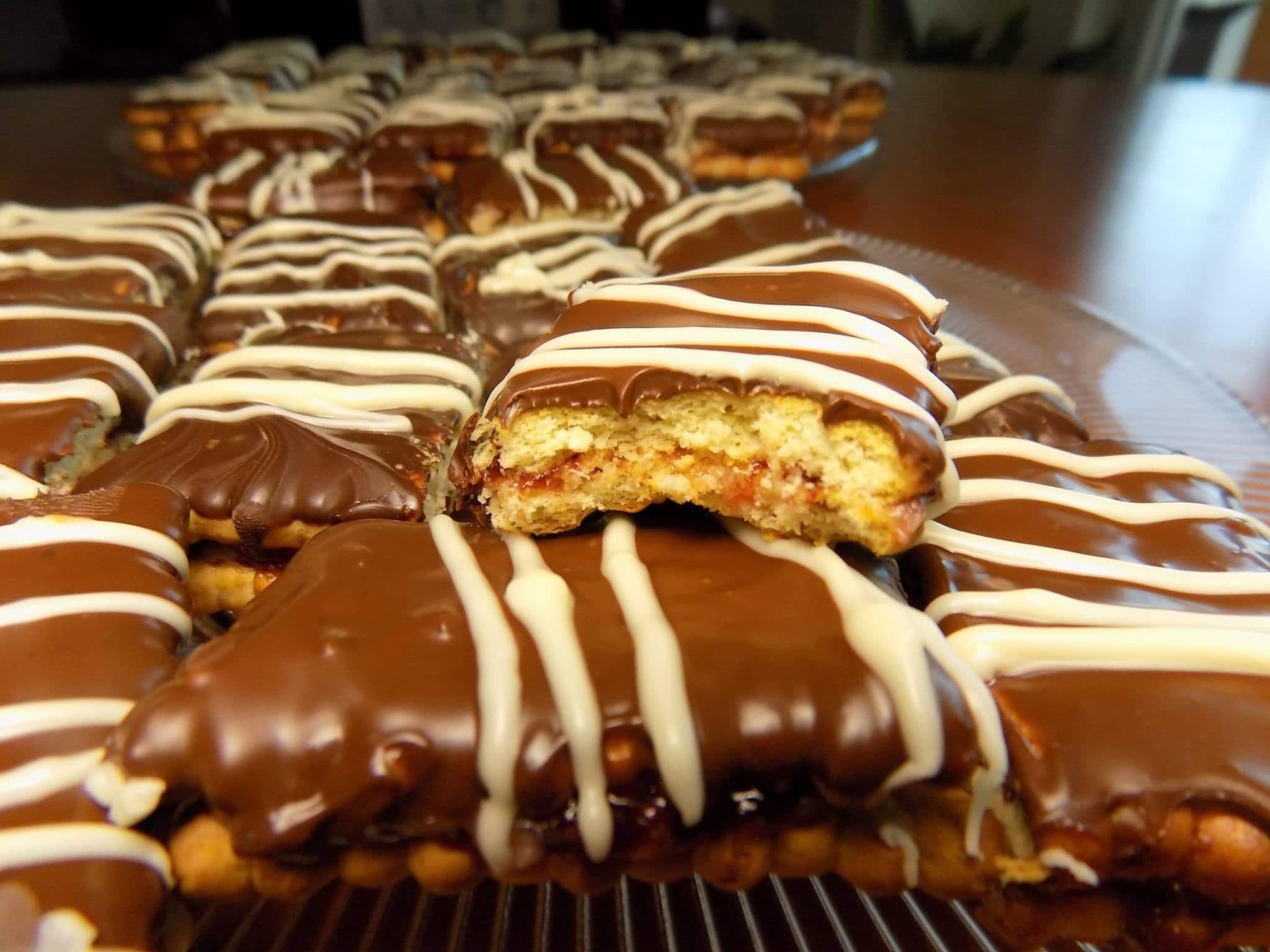 След това вадя хладилника и разрязвам всяка бисквитка на две части. На водна баня разтапям  млечния шоколада и в него потапям всяка половина. Оставям сладките върху хартия за печене да стегнат напълно. Декорирам с разтопен бял шоколад и оставям да стегне и той. След това поднасям.
