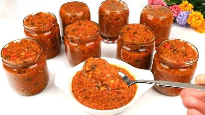 Измийте и нарежете магданоза на ситно. Добавете го в съда и разбъркайте. Варете за още няколко минути, след което свалете от огъня. Още докато е топла, напълнете в чисти буркани. Затворете с капачките им и стерилизирате.