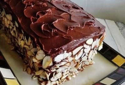Извадете десерта от хладилника и премахнете фолиото. Нанесете глазура върху него и декорирайте с филирани бадеми.