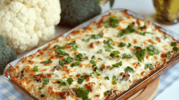 Поставете в предварително загрята до 200 градуса фурна и печете до 25-30 минути. Извадете и поръсете ястието с настърган кашкавал. Върнете във фурната и печете до златисто.