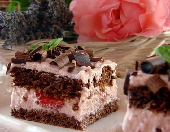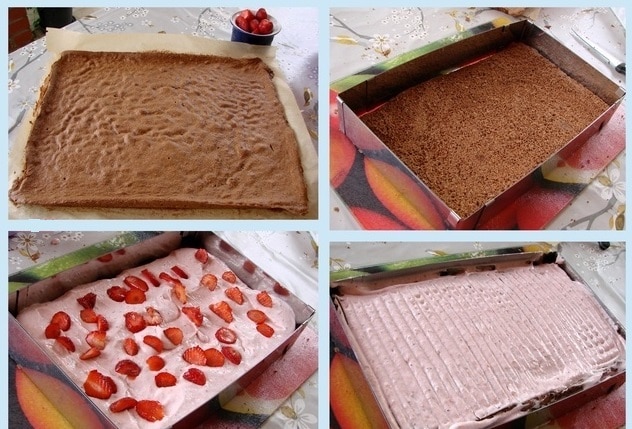 Завършете тортата като в подходяща форма поставите единия блат. Намажете го с част от крема, сложете нарязаните ягоди и покрийте с по-голямата част от останалия крем. Сложете втория блат и намажете с отделения крем. Декорирайте с настърган шоколад.