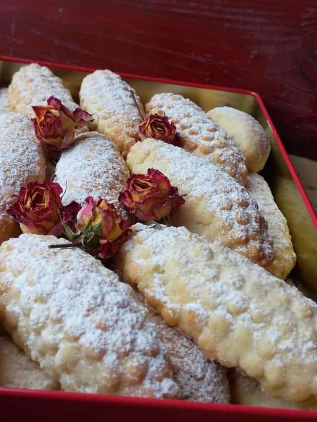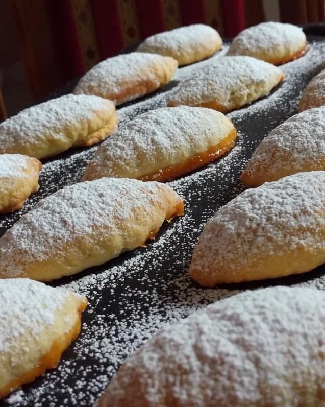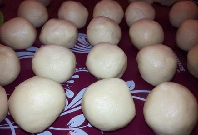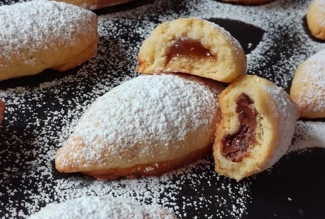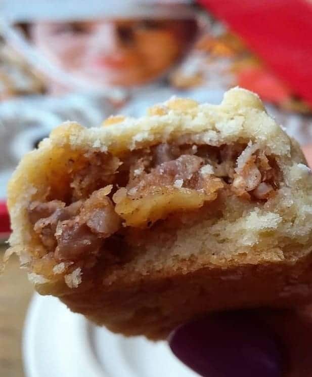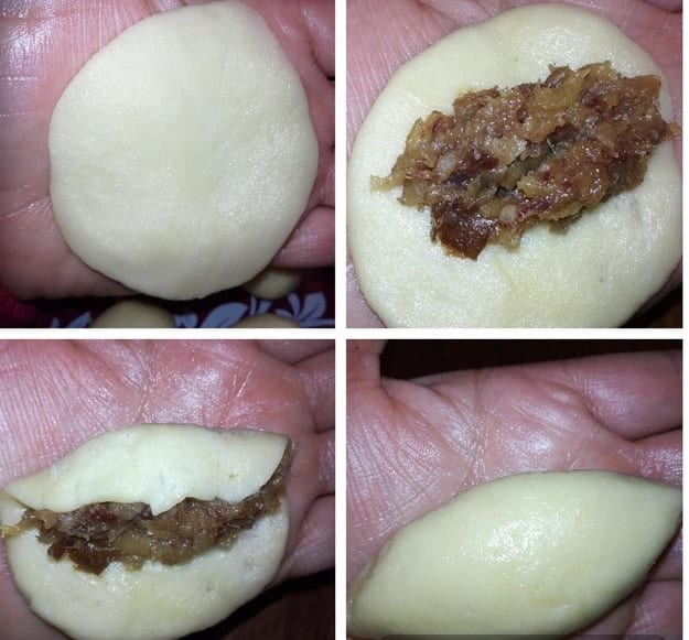 Извадете и оформете топче с големината на орех. След това сплескайте с ръка, за да предадете ефктен вид на сладките сплескатите тестот върху силиконова повърхност или използвайте друго оребрение. В средата поставете част от ябълковата плънка и слепете двата края на тестото. Повторете с останалото тесто.