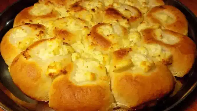 В купа разбийте разтопеното масло, захарта и прясното мляко. Добавете натрошеното сирене и разбъркайте. С тази плънка полейте милинките.