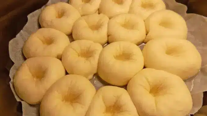 Вземете форма за печене и я намажете добре с масло. Намаслете ръцете си добре и вземете тестото. Направете го на топки с размер колкото на 1 яйце. Наредете ги едно до друго във формата. Оставете на топло да втасат. Когато милинките изпълнят формата, с пръст направете дупка във всяко топче.