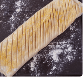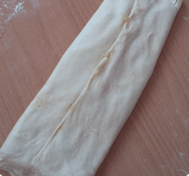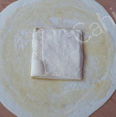 Вземете втасалото тесто и го разделете на 4 равни части. Върху набрашнена работна повърхност разточете тънка кора. Намажете добре с разтопено краве масло. Сгънете като плик и оставете настрана. Вземете втората топка и разточете кора. Намаслете добре. В средата ѝ поставете сгънатата първа кора. Отново сгънете като плик. Оставете корите да си почината за 15 минути на топло.