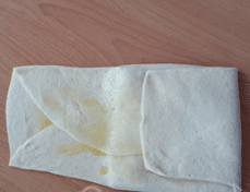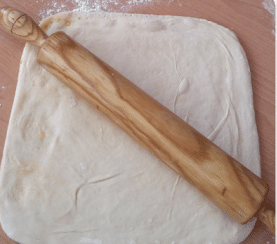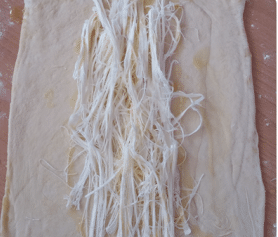 След това повторете същите действия с трета топка. Последната част от тестото също разточете, намаслете и сложете плика в средата. Отново оформете плик. С точилката го разточете във формата на правоъгълник, като се стараете кората да бъде с дебелина от 1 сантиметър. Поръсете с настърган кашкавал и сгънете на две. Притиснете краищата добре, за да прилепнат.