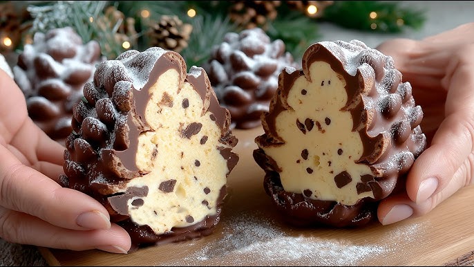 Начупете останалия шоколад и разтопете на водна баня или микровълнова фурна. С него полейте шишарките и след това подредете в съд с решетка. Оставете шишарките за 30 минути на хладно, за да стегнат. След това поръсете с пудра захар, сложете в съд за сервиране и поднесете.