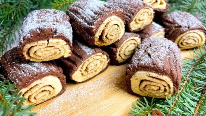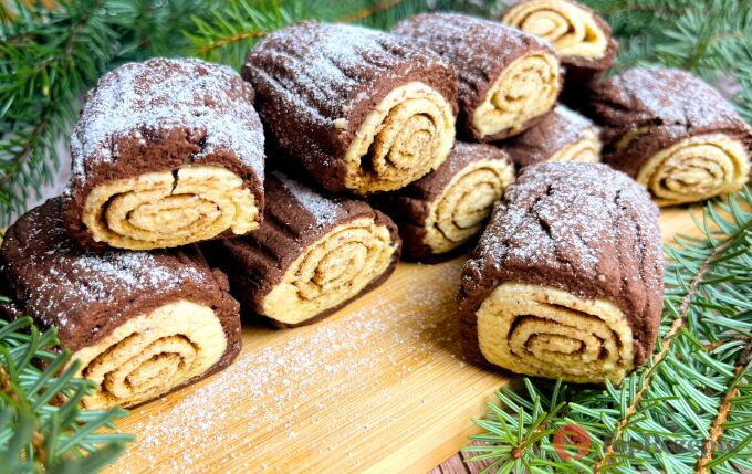 Разточете какаовото тесто и в средата му сложете бялото руло. След това внимателно завийте с какаовото тесто. Нарежете на малки парчета и с вилица направете вдлъбнатини. Така пънчетата ще бъдат по-красиви.