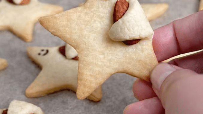 Прехвърлете върху работна повърхност и разточете кора от тестото. Изрежете с формички звездички. Поставете по 1 бадем във всяка и сгънете едното рамо, за да го „прегърне“.