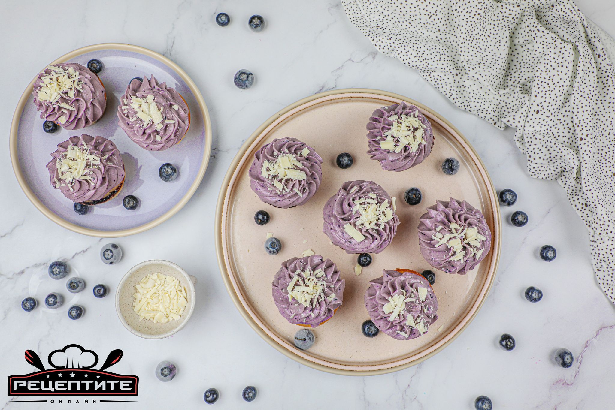 Прехвърлете в пош и шприцовайте върху всяко кексче. Поръсете с настърган бял шоколад. Оставете на хладно за да стегне фростинга и след това сервирайте.