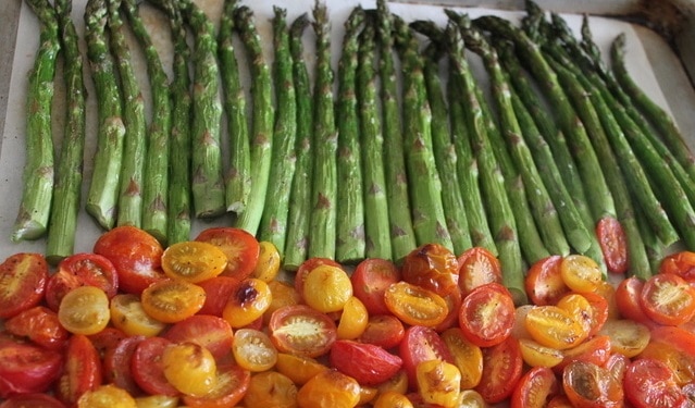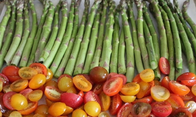 Покрийте форма за печене с хартия и върху нея подредете аспержите една до друга. До тях подредете чери доматите.