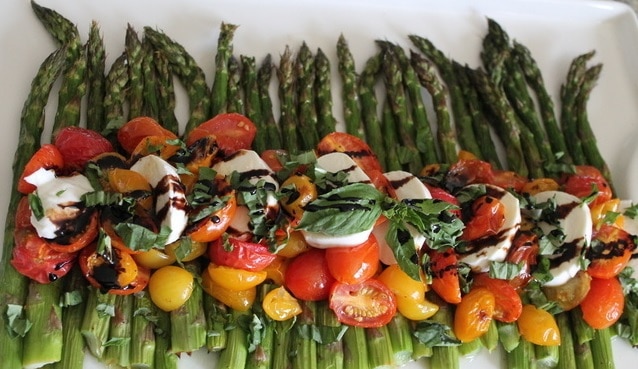 Извадете и прехвърлете аспержите в чиния за сервиране. Върху тях сложете доматите. Нарежете моцарелата на филийки и я поставете върху доматите. Поръсете с няколко капки балсамов оцет и нарязан пресен босилек.