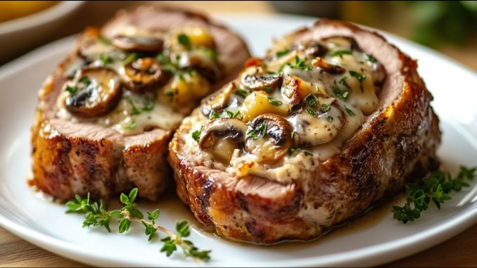 Разпределете тази плънка над месото и навийте на руло. Вържете с конец и сложете във форма за печене. Покрийте с алуминиево фолио и сложете в предварително загрята до 200 градуса. Печете за 20-25 минути.