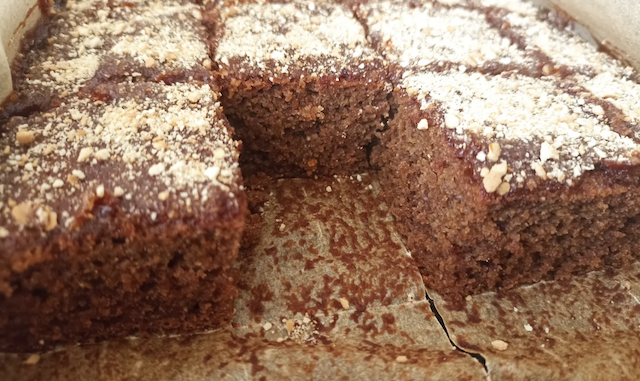Поставете в предварително загрята до 200 градуса фурна и печете за 30 минути или докато клечката, с която пробвате излезе суха. Щом това стане, извадете десерта и оставете да се охлади. Намажете със сладко и поръсете със смлени орехи. Нарежете и поднесете.
