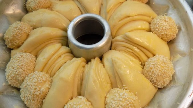 Намазвам форма за кекс обилно с меко краве масло и поставям триъгълниците и топчета. Така оформената питка оставям да втасва до удвояване на обема. Накрая намазвам с жълтъка, разбъркан с 2-3 супени лъжици прясно мляко.