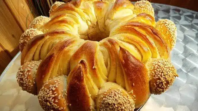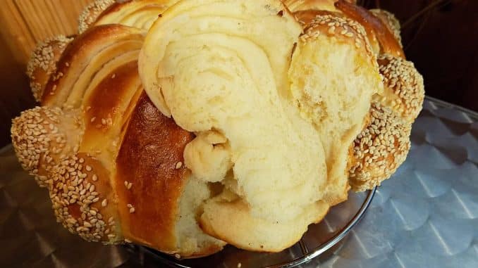 Втасалото тесто разделям тестото на 3 равни части. От всяка разточвам правоъгълник и намазвам с масло, олио или мас. Слагам ги един върху друг, като намазвам и последния и след това навивам на руло. Режа го на сравнително еднакви триъгълници. Остатъците разделям по равно и оформям топчета от тех. Всяко намазвам с разбит жълтъка и потапям в сусам.