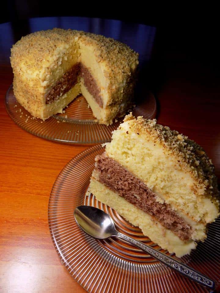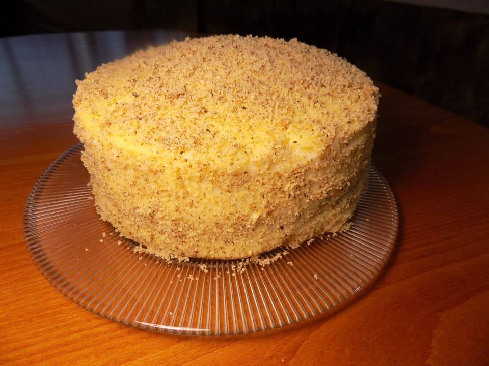 Между блатовете и отстрани намазвам с крем, а след това поръсвам със смлени орехи. Тортата става мека и сочна и няма нужда да се сиропира.