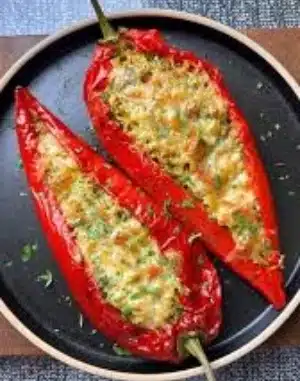 Извадете и прехвърлете пълнените чушки в чинии за сервиране. Поръсете с малко пресен магданоз и поднесете.