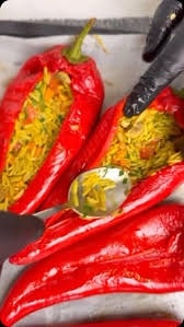 Извадете чушките от фурната и с нож срежете всяка през средата. Напълнете ги с плънката от ориз и зеленчуци. Настържете кашаквала и поръсете свяка чушка. Върнете във фурната за още 10-15 минути или до златисто кафява коричка.