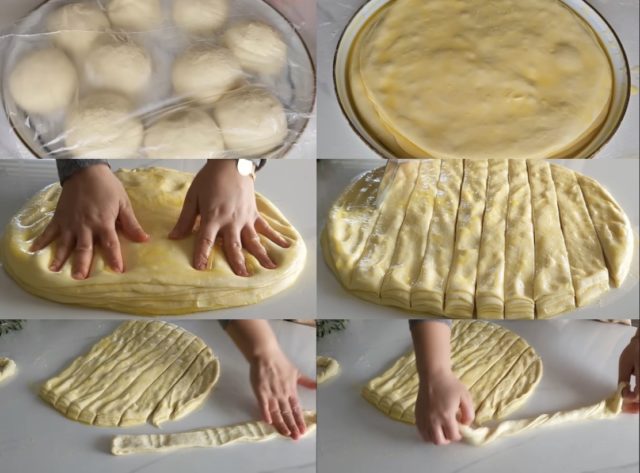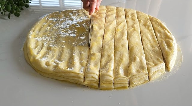 След това внимателно разтегнете кората с ръце. за да се слепят добре корите. Нарежете на ленти с дебелина около два пръста.