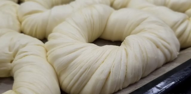 Разтегнете всяка лента, като леко я натискате с пръсти, сгънете я наполовина, усучете я спираловидно в обратната посока и съберете краищата ѝ, за да оформите форма на геврек.