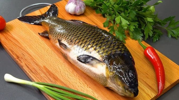 Вземете почистения шаран и отрежете перките му. След това направете няколко процепа от двете страни на рибата. Смесете малко олио, сол и черен пипер и подправка за риба. След това намажете добре шарана отвътре и отвън.