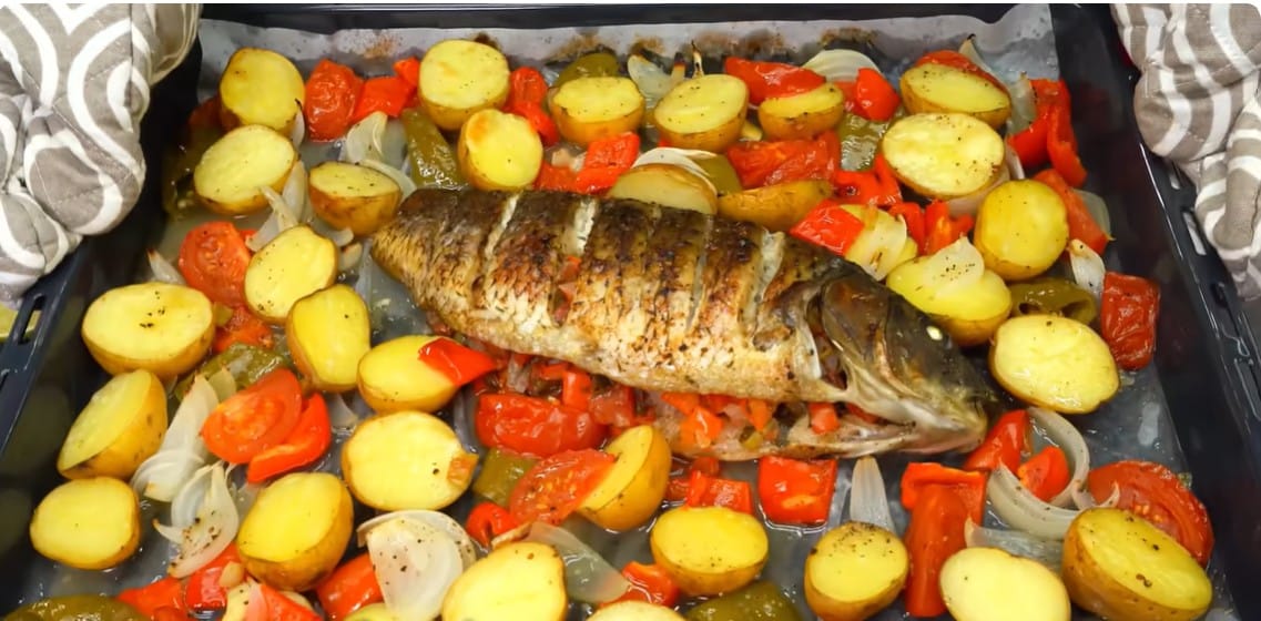 Покрийте форма за печене с хартия и сложете шарана в нея. Обелете и нарежете картофите. Подредете ги край рибата. Нарежете лютите чушки на едри парчета и прибавете в съда. Обелете и нарежете на едри парчета другата глава лук. След това поставете при останалите зеленчуци. Нарежете домата на резени и го прибавете. Нарежете останалия чесън и поръсете зеленчуците. Овкусете със сол, черен пипер и налейте олио. Разбъркайте зеленчуците добре.