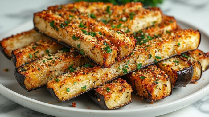 Покрийте форма за печене с хартия и намажете с малко олио. Подредете ивиците патладжан в нея и сложете в предварително загрята до 200 градуса фурна. Печете за 25 минути или до златисто кафяво. Извадете и сложете в съд за сервиране.