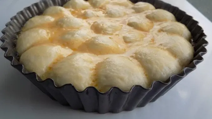 От втасалото тесто оформям топчета с големина на лешник или по желание. Всяко потапям в масления крем и подреждам във форма за печене. Аз използвах тава с диаметър от 25 сантиметра. Така приготвените милинки поливам с осналия маслен крем. След това оставям  отново на топло място да втасат.